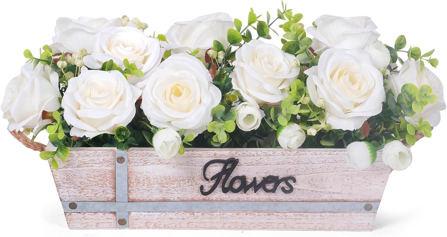 - Durable & Low-Maintenance Elegance: Expertly crafted from premium silk blooms and durable plastic eucalyptus stems, this lifelike arrangement captures the beauty of fresh roses and foliage without any upkeep. Securely nestled in a sturdy wooden planter that adds rustic charm, the lightweight yet stable design allows you to easily reposition your centerpiece for stunning displays anywhere in your home.