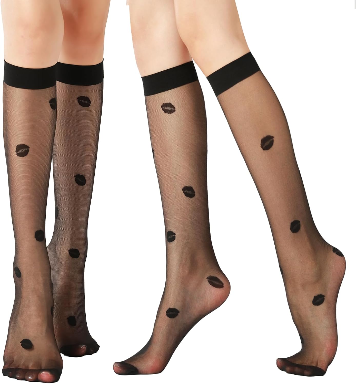 G&Y 4 Pairs Pattern Knee High Pantyhose with Reinforced Toe - 30D Nylon Stockings for Women Dot Heart Lip Patterned
