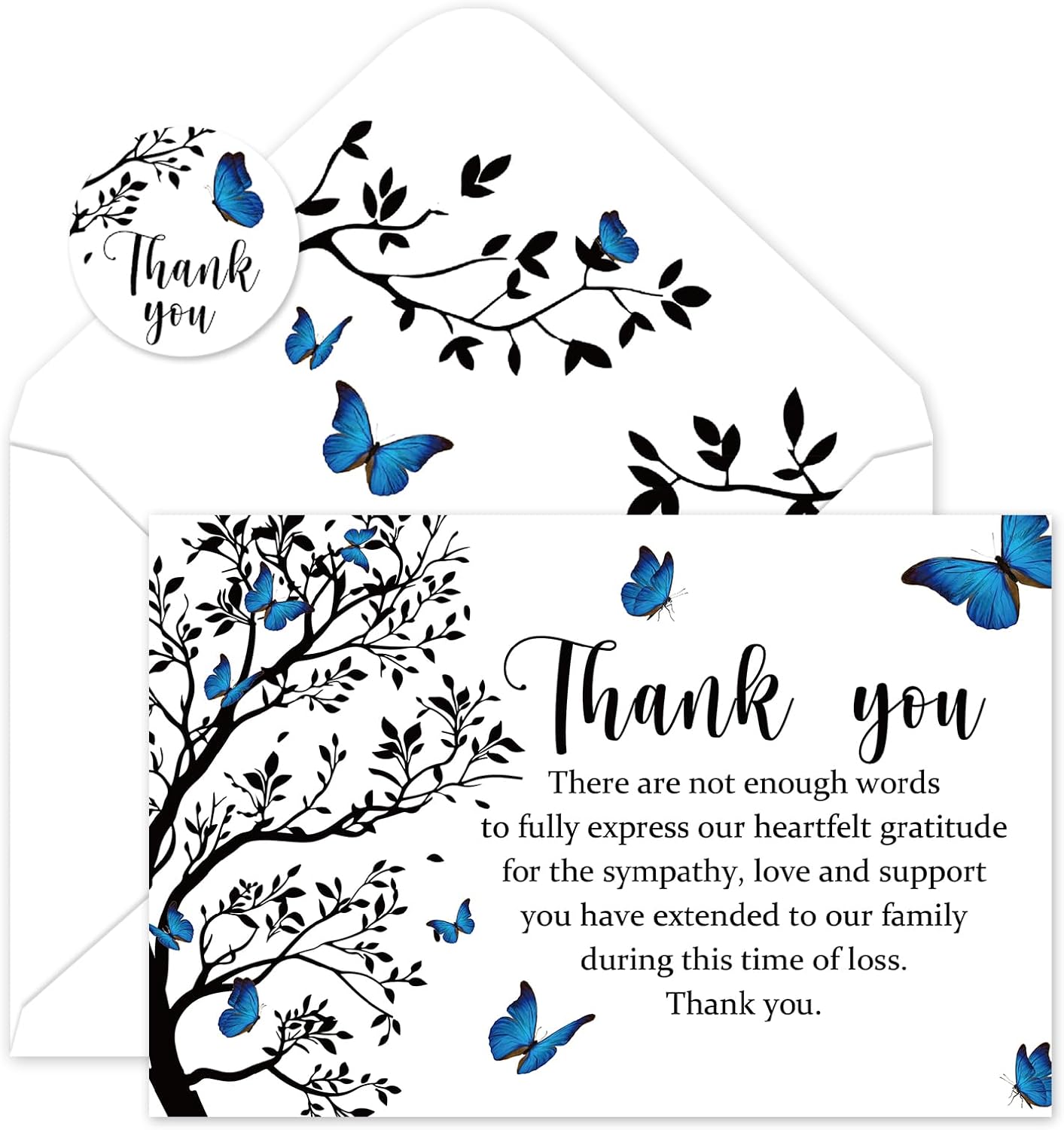 - THOUGHTFUL DESIGN: Our funeral thank you cards are patterned with blue butterflies and black branches, printed with the words to express your thanks to those who attends the funeral, look very elegant