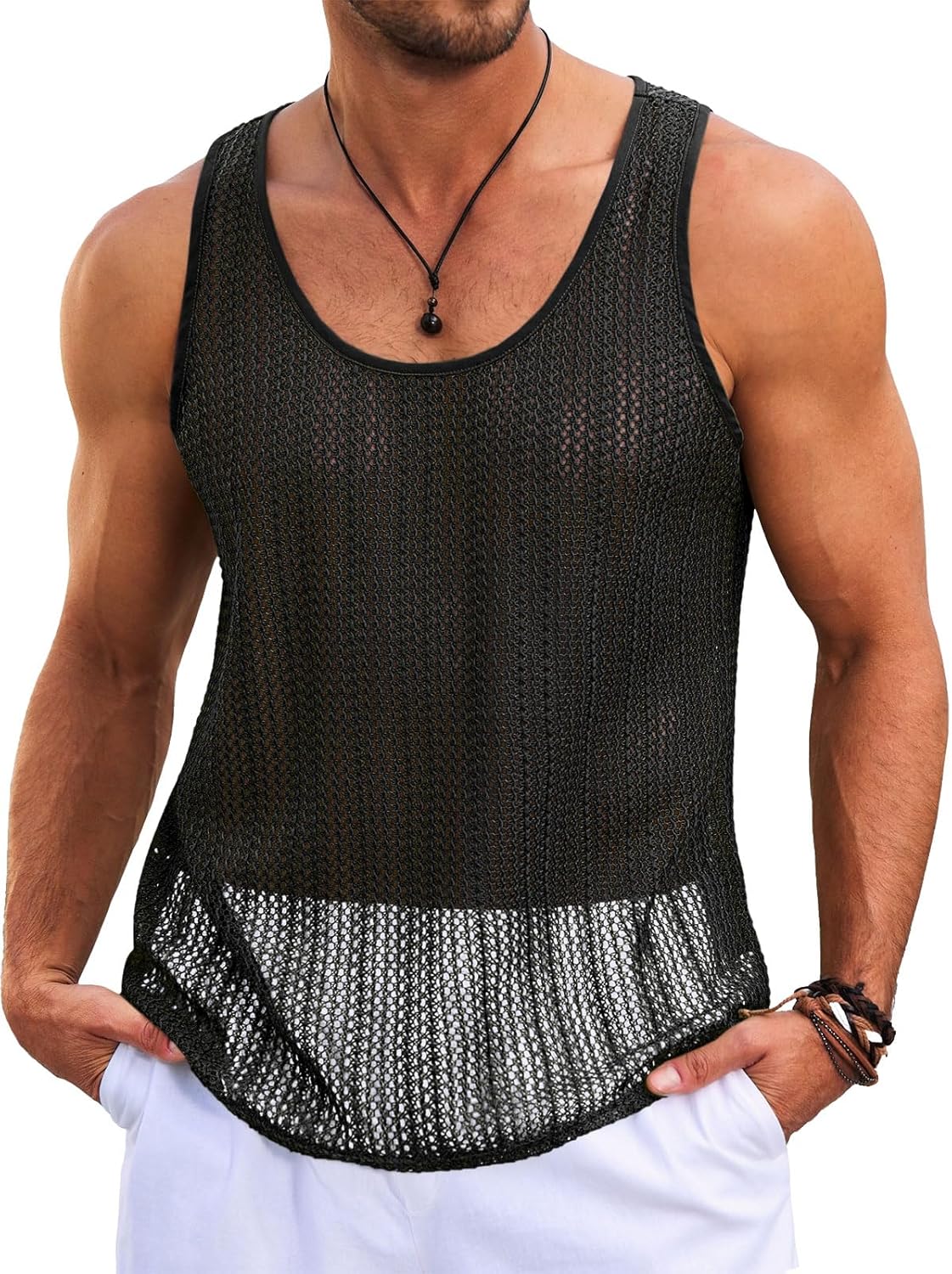 Runcati Mens Sleeveless Tank Tops Knitted Crochet See Through Hollow Out T-Shirts Muscle Summer Beach Hippie Shirts