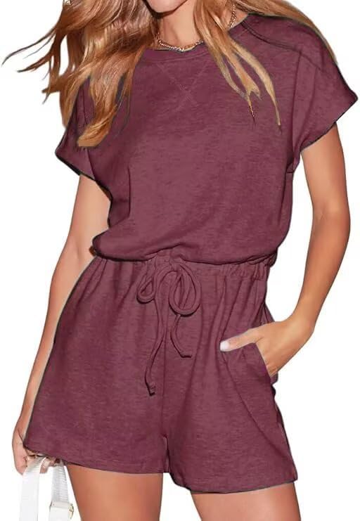 BONITEE Womens Short Sleeve Rompers 2026 Casual Dressy Summer Crewneck Jumpsuit Drawstring Beach Travel Vacation Outfits