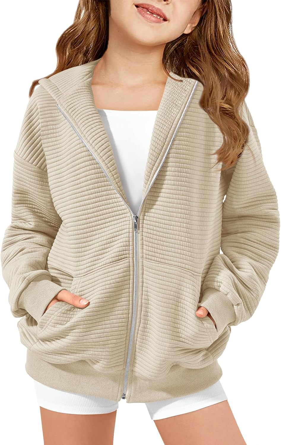 Haloumoning Girls Zip Up Hoodie Kids Fashion Oversized Textured Sweatshirt Jacket with Pockets 5-14 Years