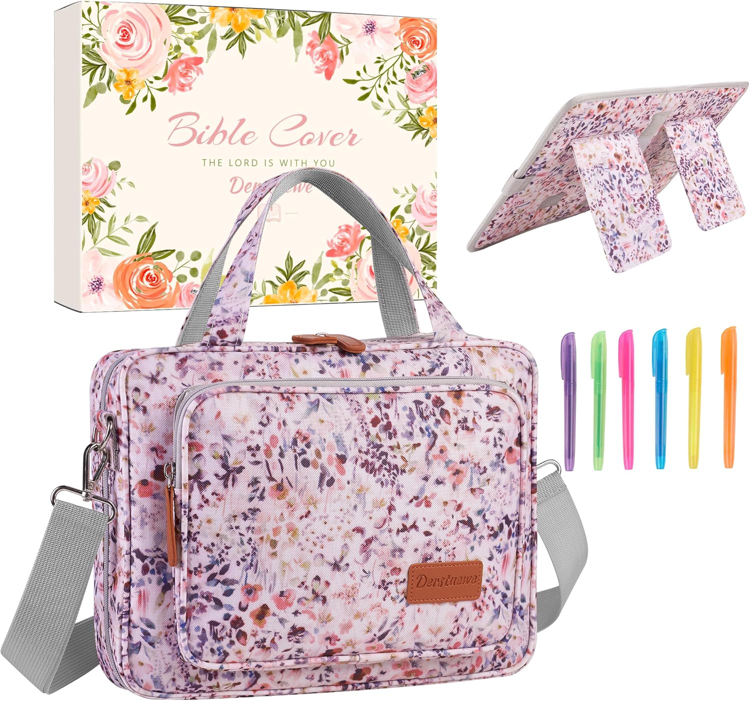 DERSTUEWE Bible Cover Case for Women – Stylish & Durable Bible Bag with Zippered Closure, Floral Print, Fits Standard & Large Bibles, Perfect for Church & Travel, Floral Print