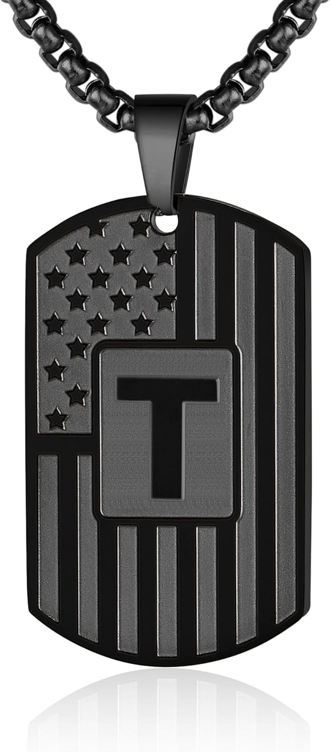 Initial A-Z Necklace for Men American Flag Dog Tag A-Z Pendant 316L Stainless Steel Chain 22+2 Inches Personalized Patriotic Jewelry for Men