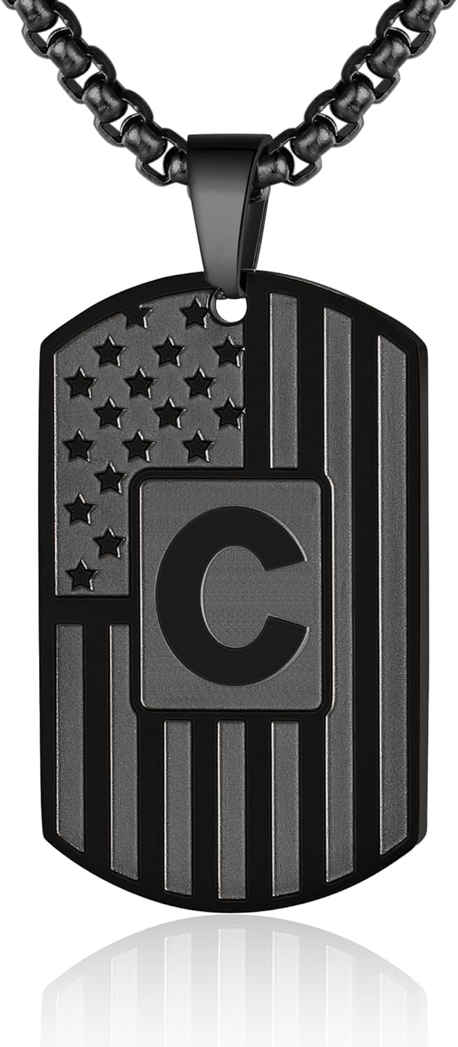 Initial A-Z Necklace for Men American Flag Dog Tag A-Z Pendant 316L Stainless Steel Chain 22+2 Inches Personalized Patriotic Jewelry for Men