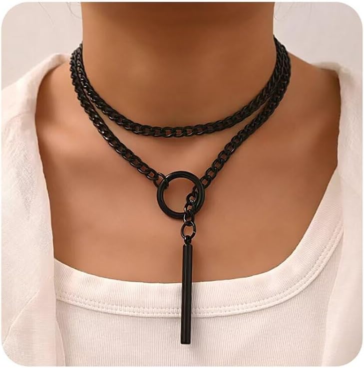 Black Lariat Y Necklaces for Women Goth Stainless Steel Cuban Link Chain Column Pendant Necklace Jewelry Gift