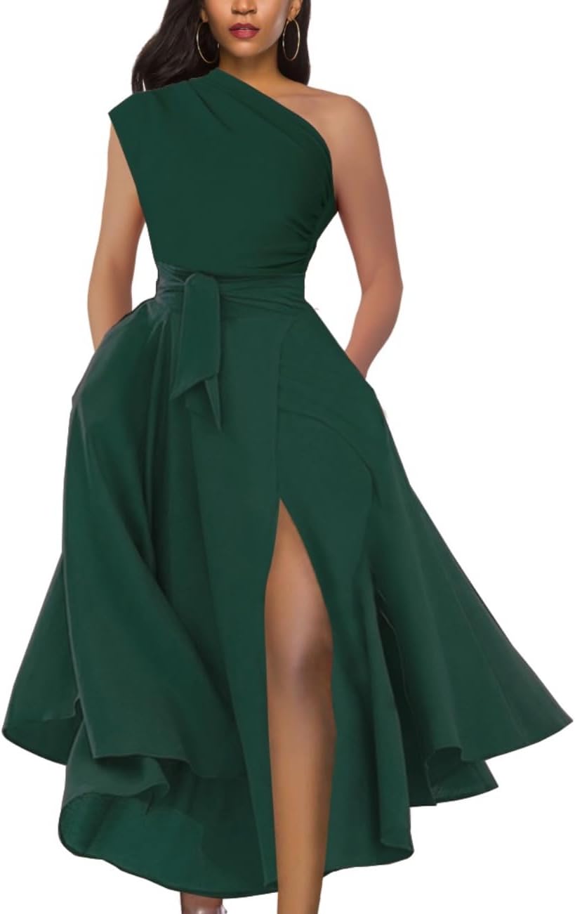Women's One Shoulder Sleeveless Belted Side Slit Cocktail Party Swing Dress with Pockets