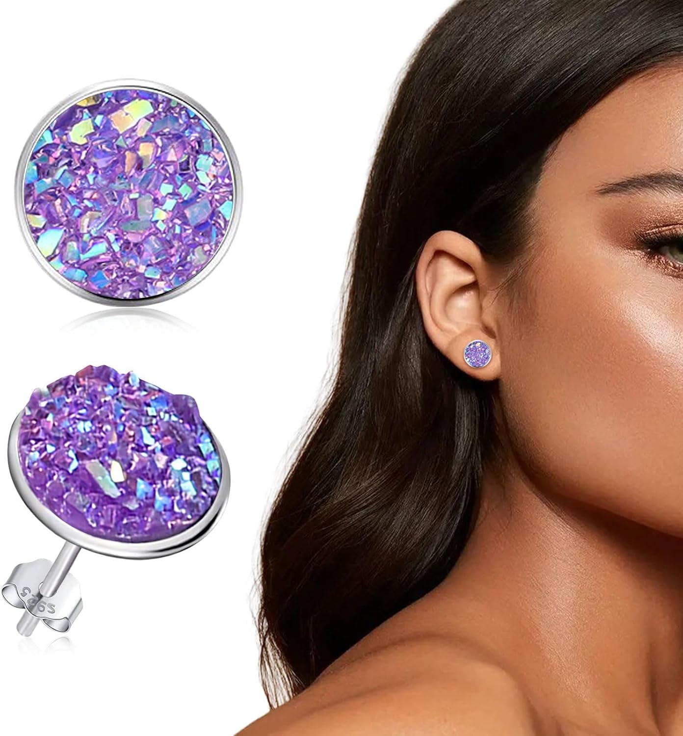 Silver-tone Faux Druzy Stud Earrings,925 Sterling Silver Hypoallergenic Natural Gemstone Earrings for Women Trendy Fashion