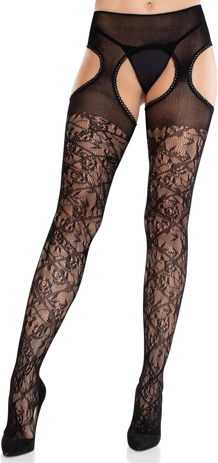 Leg Avenue Women’s Scalloped Trimmed Floral Lace Lingerie Suspender Stockings for Women Sexy, Black, One Size