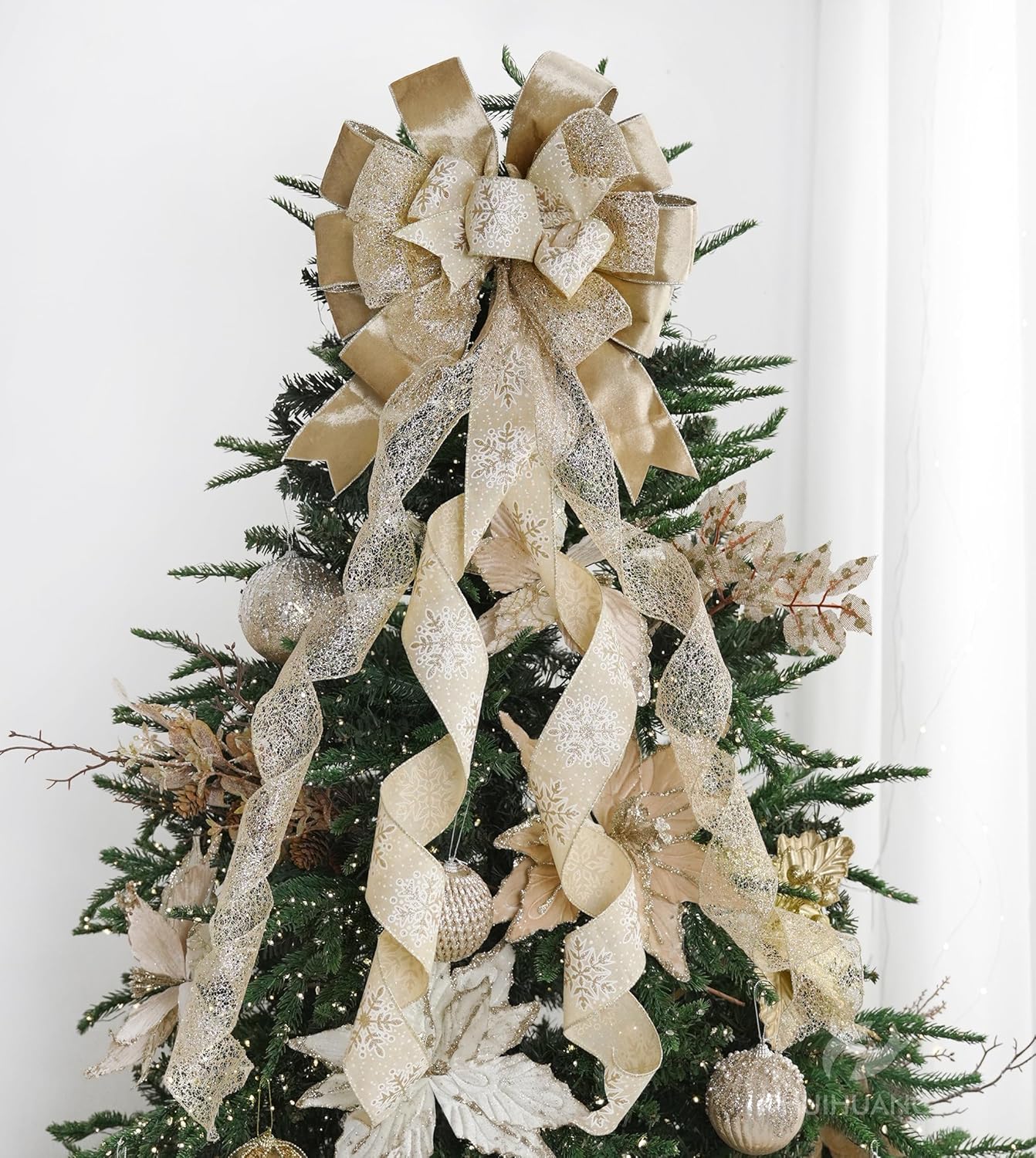 - Oversized Christmas Tree Topper Bow: This champagne gold large bow measuring approximately 13” wide x 45” long, making it large enough for most sizes of Christmas trees and it's the perfect choice for topping Christmas trees and holiday décor