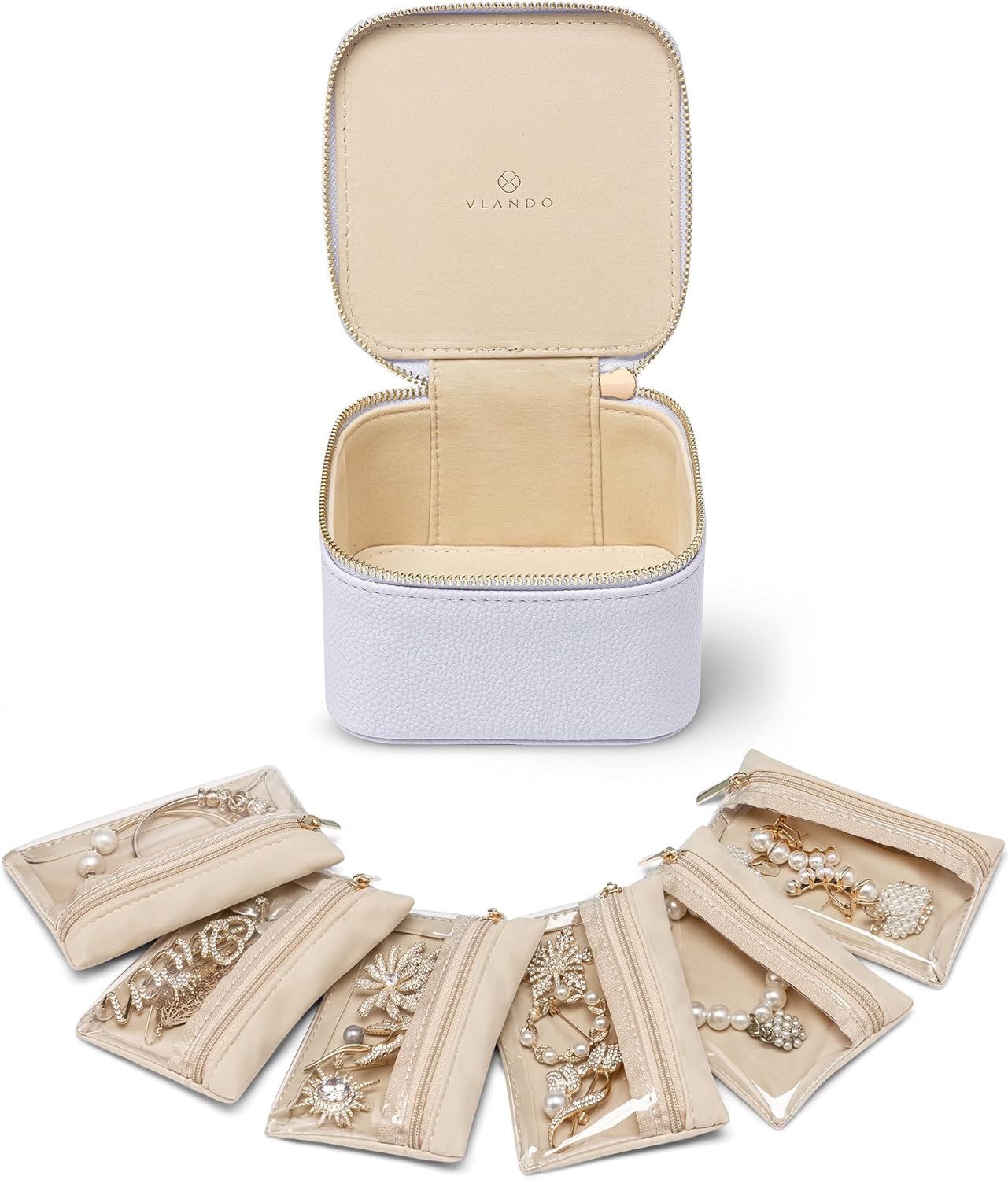 Vlando Travel Jewelry Case Organizer, Small Jewelry Box with 6 Velvet Jewelry Zipper Bags,Christmas Gifts for Women Girls Friends-Purple