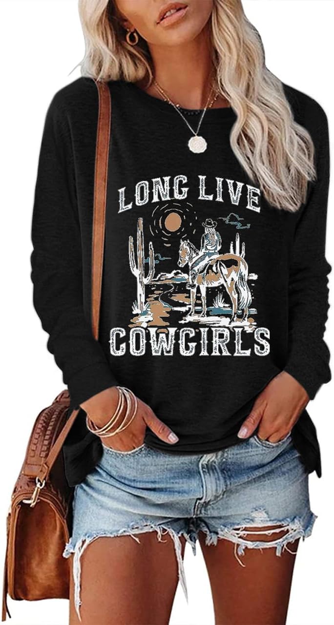 Women's Western Cowgirl Long Sleeve Shirts Vintage Country Music Fall T-Shirt Hiking Travel Sweatshirt Tops