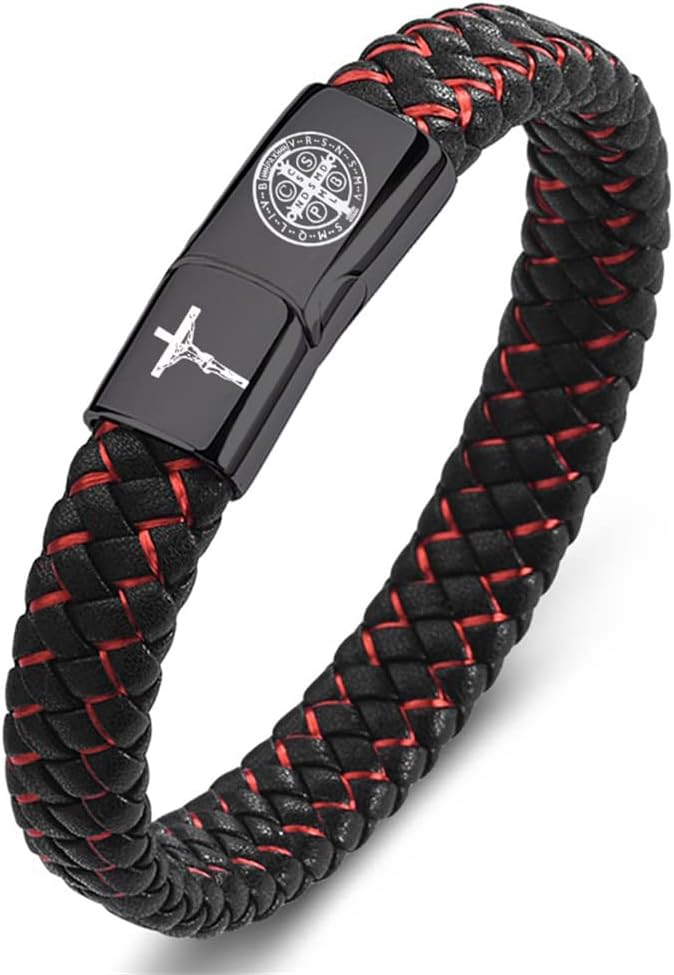 St. Benedict Cross Exorcism Bracelet Stainless Steel Crucifix Cuff Roman Catholic Leather Wristband Bangle Protection Amulet Jewelry Gift for Him, 8.46''