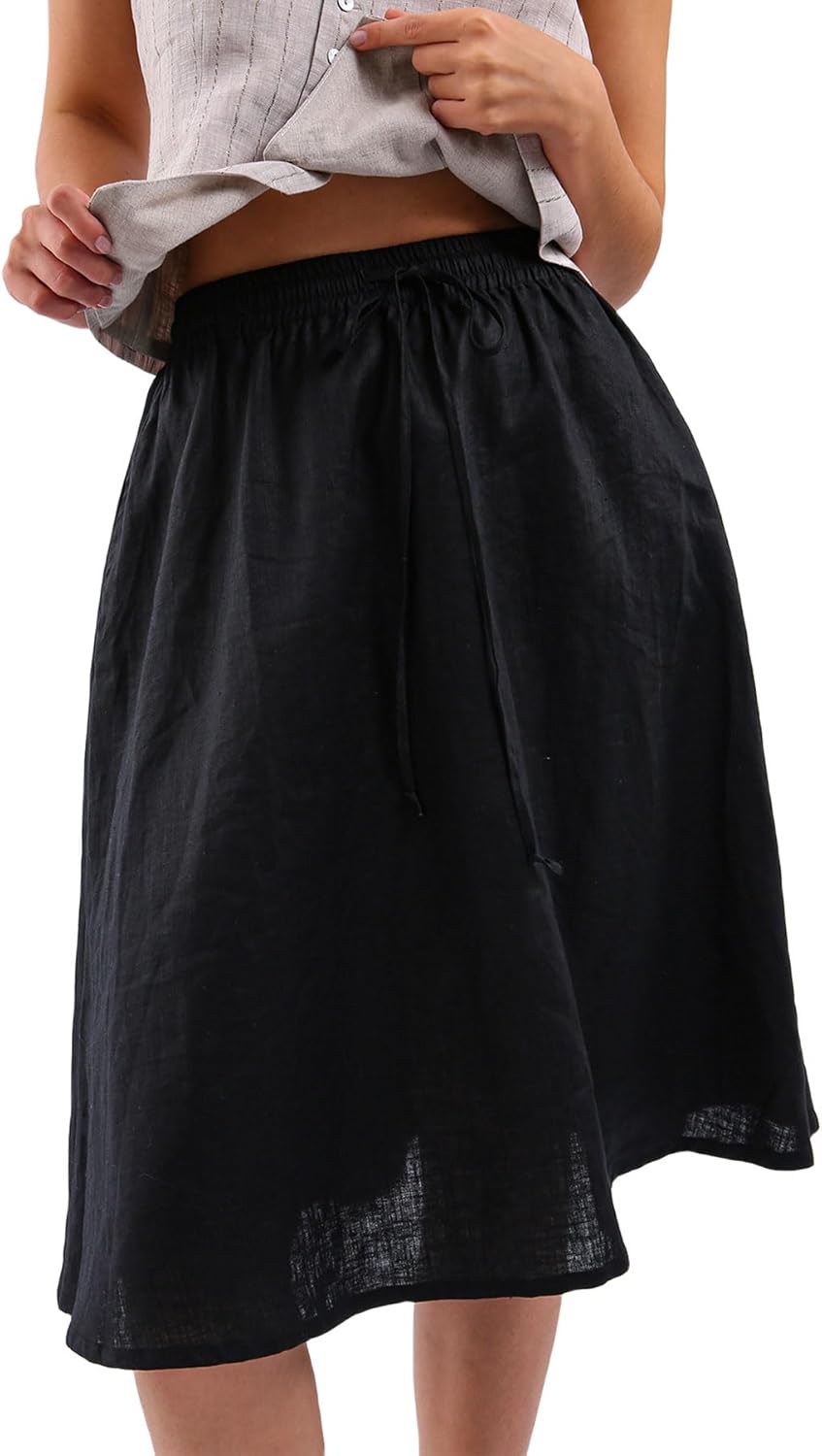 Amazhiyu Womens Pure Linen A Line Pleated Midi Skirt Elastic Waist with Pockets Black, X-Large