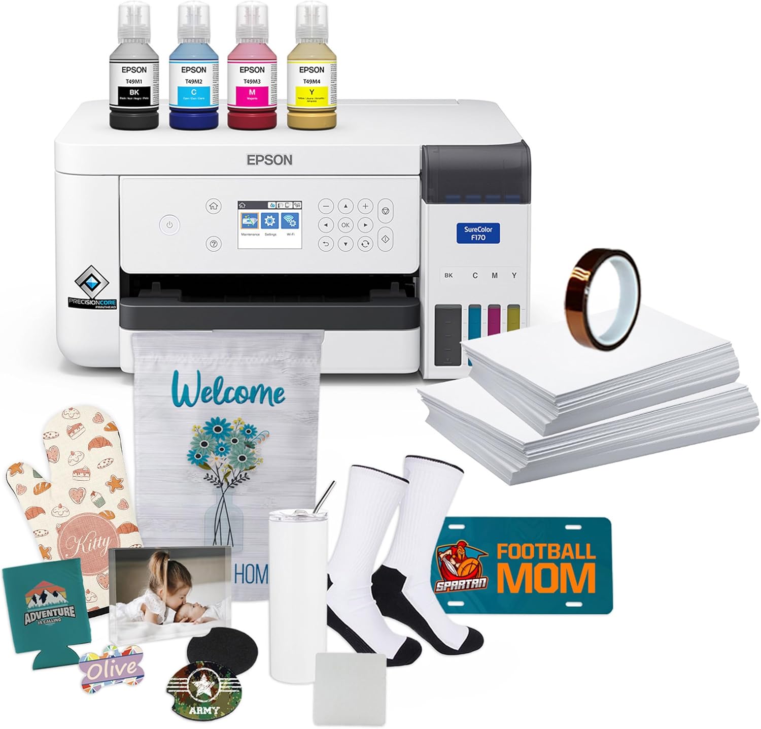 - Astounding Print Quality - Epson's Surecolor F170 Sublimation printer boasts the PrecisionCore printhead which offers Precision Droplet Control for the most outstanding image clarity on the market. Included in the printer bundle: full set of Epson sublimation ink, user guide, AC power cable, Hotronic 9" x 12" press, thermal tape, 8.5" x 11" & 8.5" x 14" paper.