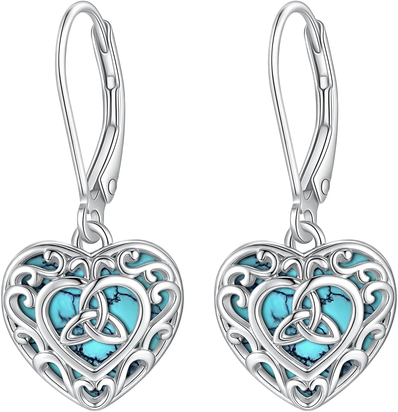 Turquoise Earrings for Women Sterling Silver Celtic Knot Heart Dangle Earrings Filigree Drop Leverback Jewelry Mothers Day Gifts