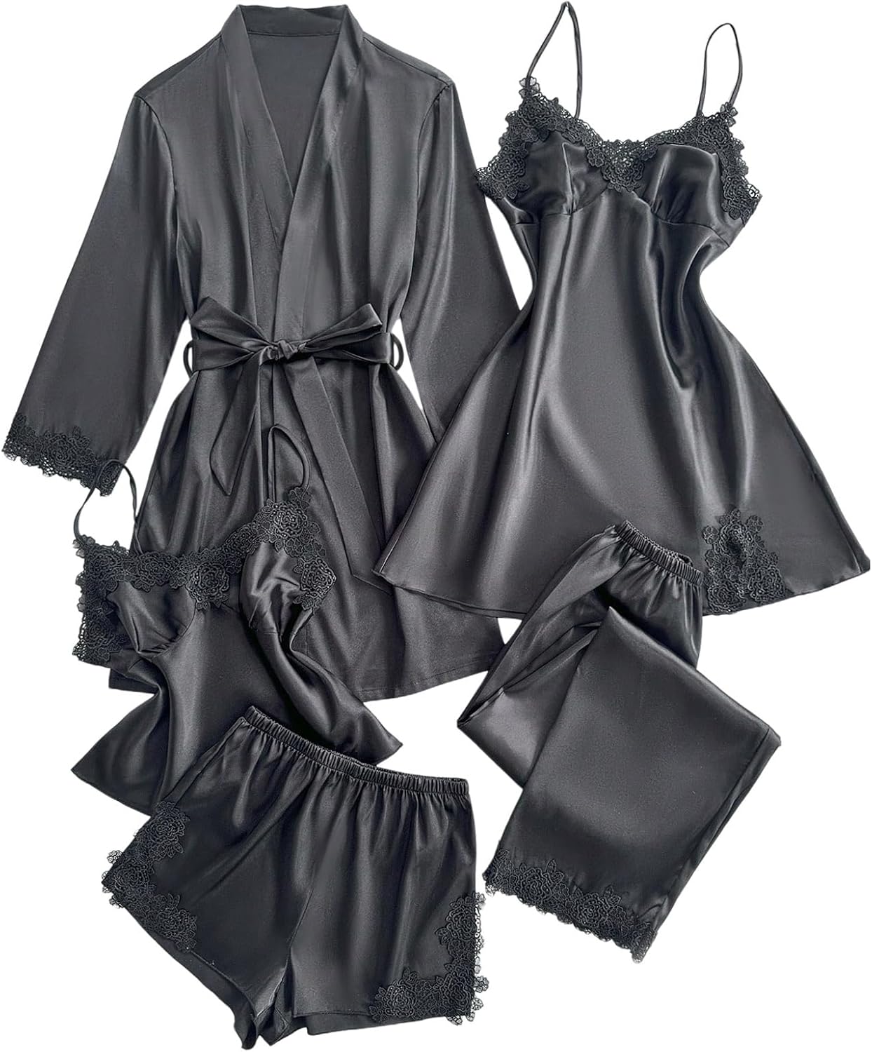 OYOANGLE Women's 5 Pack Satin Pajama Set Lace Trim Nightgown Cami Top with Shorts Pants and Robe Sets Sleepwear