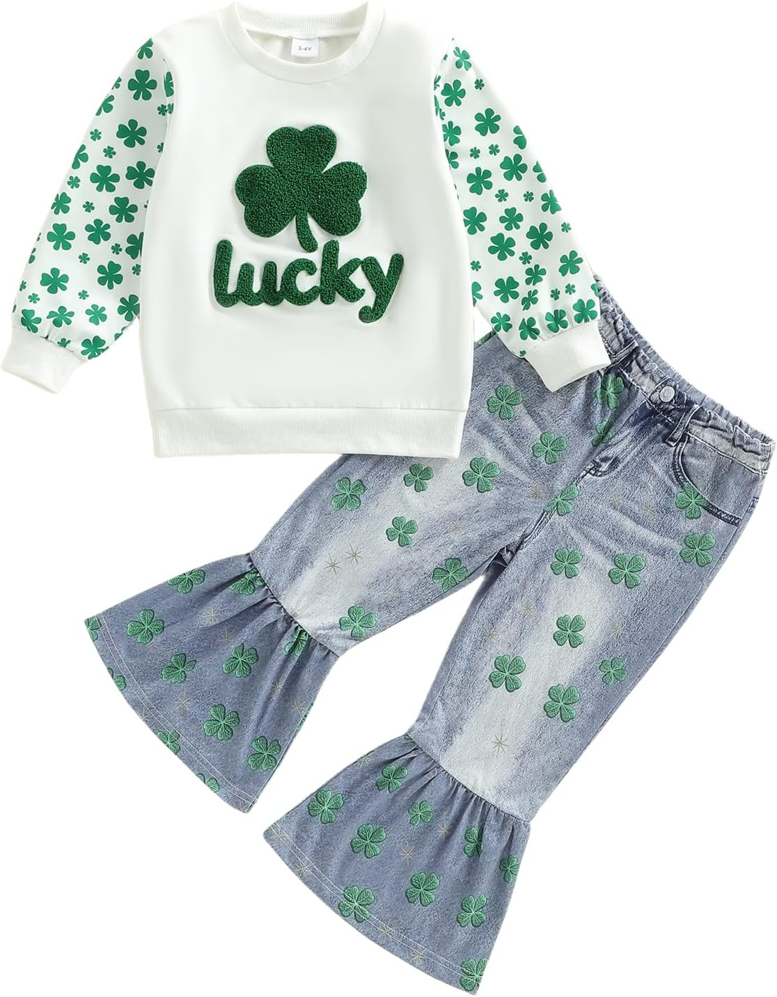 Toddler Girl St Patricks Outfit Lucky Clover Sweatshirt Bell Bottoms Jeans Little Girls Spring Fall Winter Clothes