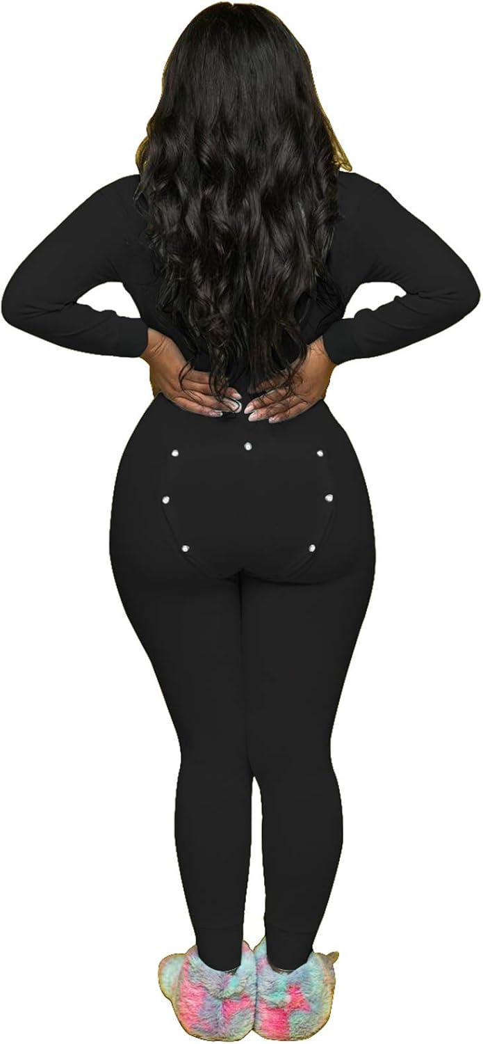 Women Butt Flap Bodycon Jumpsuit One Piece Pajamas Long Sleeve V Neck Romper Sleepwear