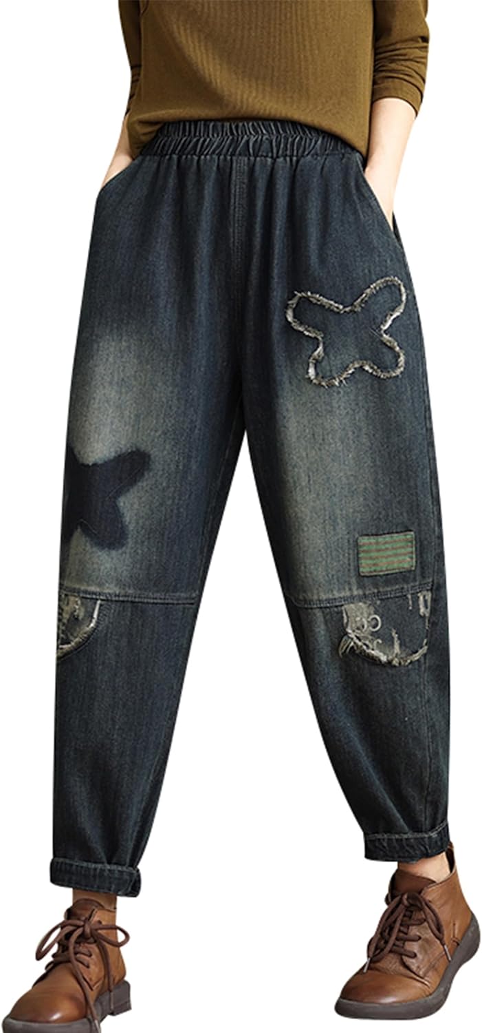 LAI MENG FIVE CATS Women's Baggy Jeans Pattern Elastic Waist Casual Harem Pants Barrel Denim