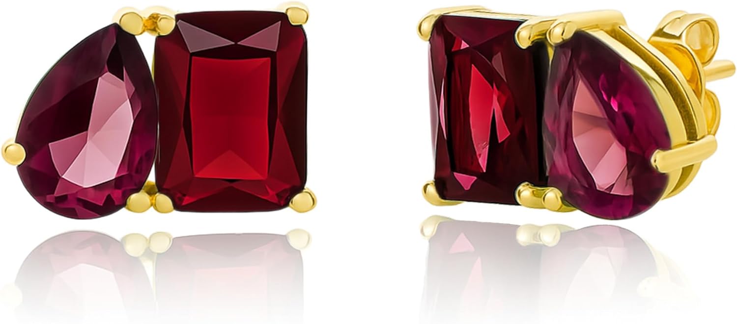 14K Gold Plated January Birthstone Two Tone Stud Earrings for Women with Secure Pushbacks, Garnet Color Earrings