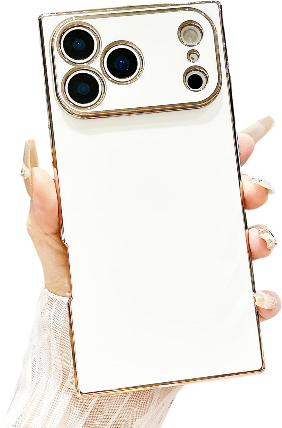YTanazing Rectangle Case for iPhone 17 Pro Max, Luxury Plating Elegant Gold Edge Reinforced Corners Cover with Full Camera Protection Shockproof Silicone Phone Case for Women Girls, White