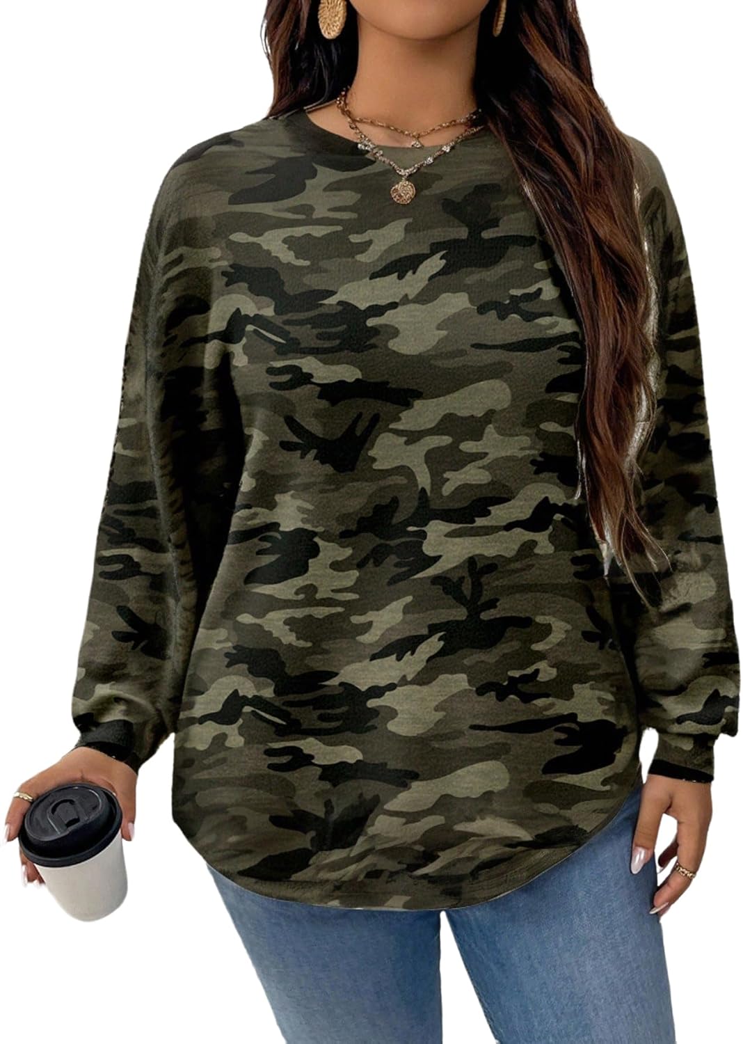 Women's Plus Size Camo Sweatshirts Crewneck Long Sleeve Drop Shoulder Fall Tops