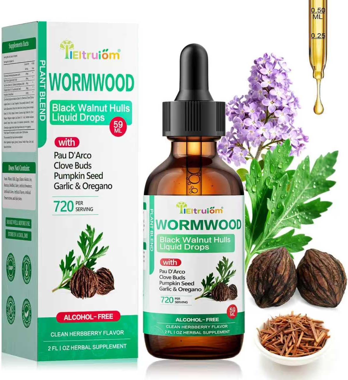 - Black Walnut Wormwood: Wormwood tincture Male and Female Intestinal Health Herbal Blend features wormwood, garlic oil, black walnut hulls, pumpkin seed, oregano oil, turmeric, and other plant-based ingredients. Garlic naturally contains vitamin C, while black walnut oil provides vitamin A. This gentle herbal combination is crafted to support normal digestive function and help maintain everyday wellness