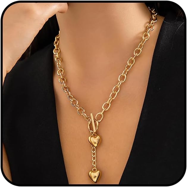 Chunky Gold Heart Ot Buckle Necklaces for Women Double Heart Toggle Clasp Pendant Necklace Hip-Hop Love Chain Choker Necklace Jewelry Accessories