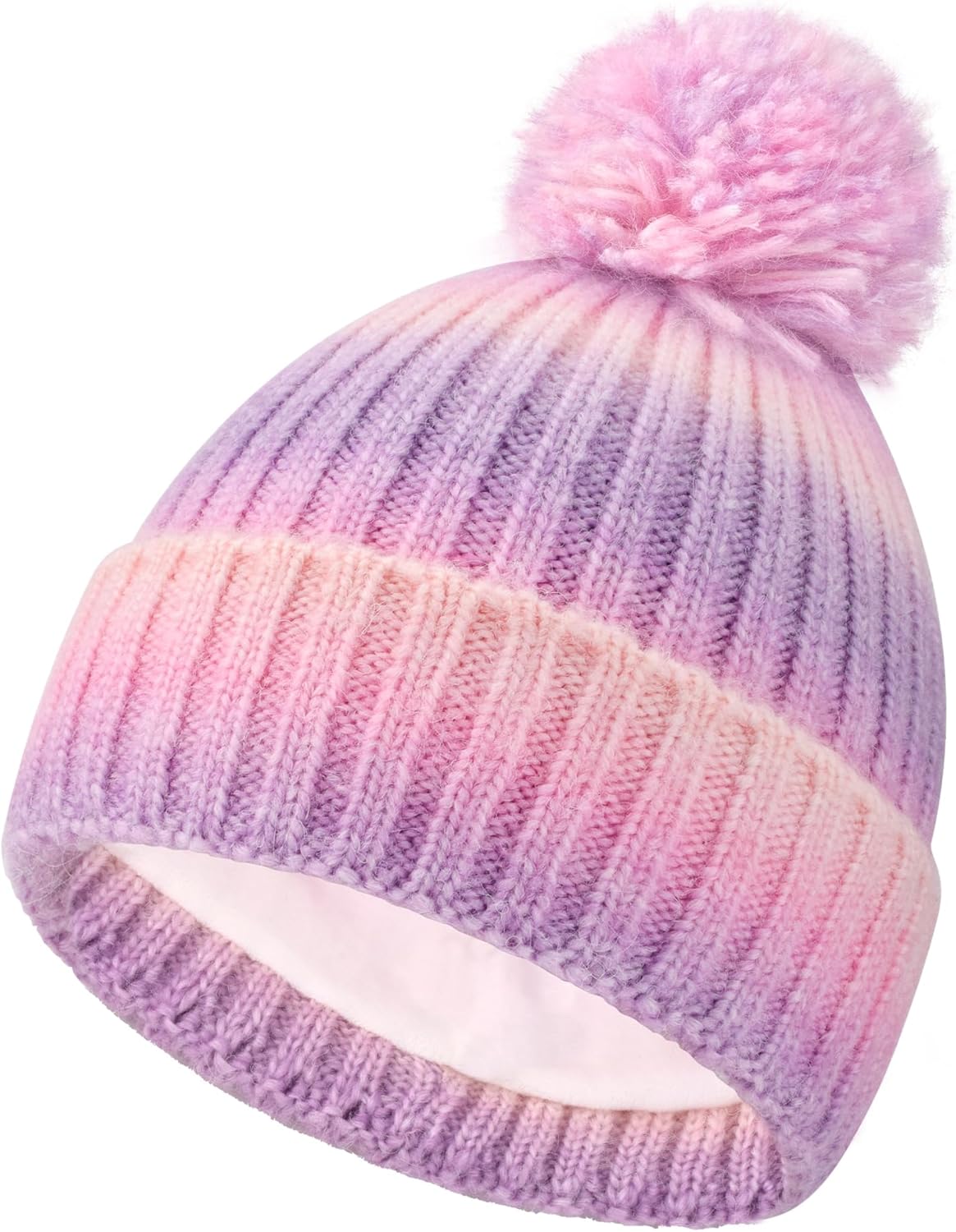 Girls Winter Knit Beanie with Pom - Warm Fleece Lined Hat Ages 3-8, Colorful Cable Knit, Cuffed Edge