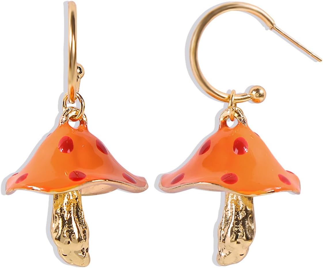 FUTIMELY Dainty Mushroom Shape Pendant Drop Dangle Earrings for Women,14K Gold Plated Fun Simulation Metal Enamel Mushroom Hoop Earrings Preppy Personalized Jewelry