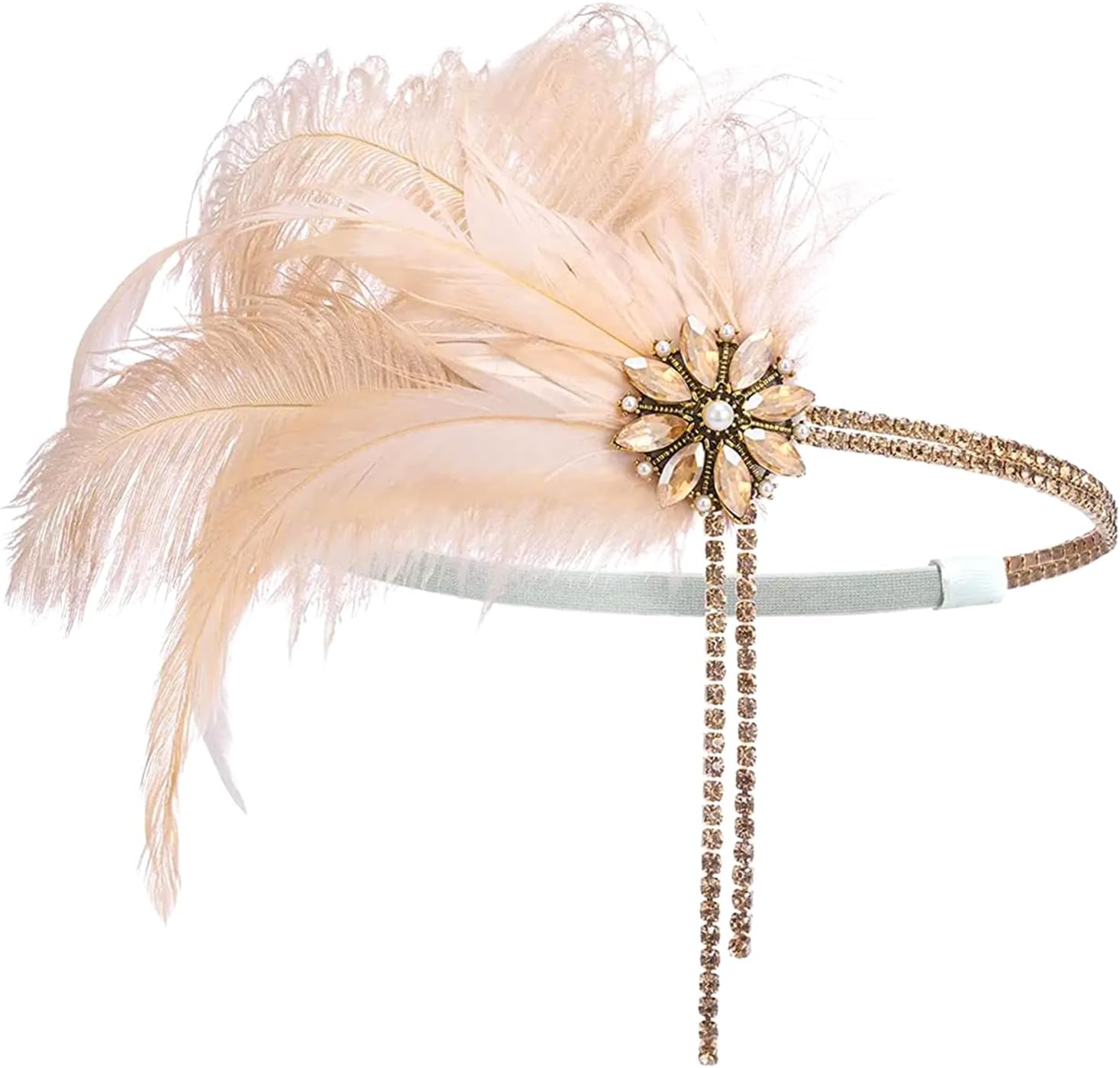 1920s Flapper Headpiece Great Gatsby Style Feather Headband Roaring 20s Headpiece Rhinestone Champagne Vintage Headband Hair Decoration for Women and Girls