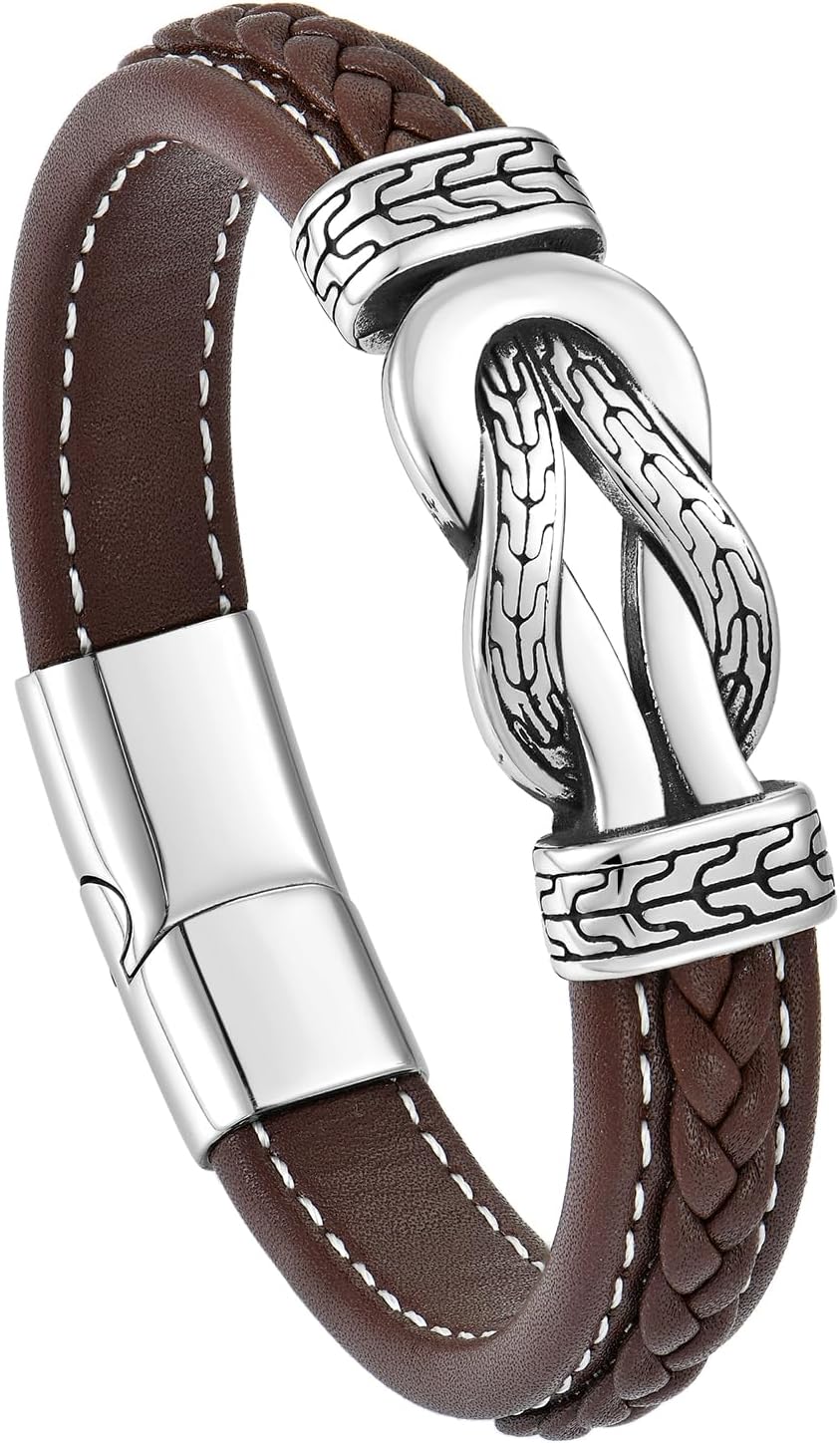 Infinity Knot Leather Bracelet for Men, Stainless Steel Black/Brown/Blue/Red/Green Genuine Leather Braided Bracelet Wristband Cuff Jewelry Gift for Men Father Husband