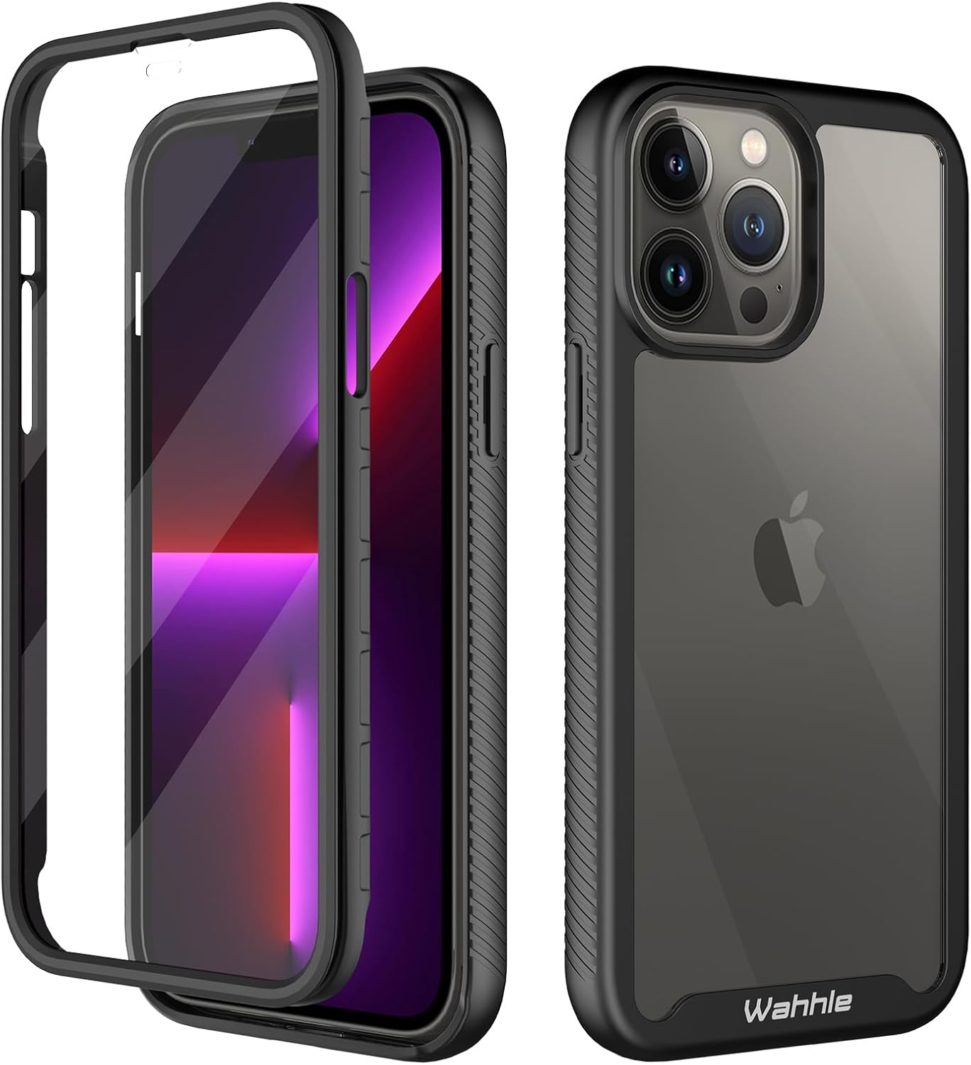 wahhle Compatible with iPhone 13 Pro Max Case, Built in Screen Protector Full Body Shockproof Slim Fit Bumper Protective Phone Cover 6.7'' Men Women-Black/Clear