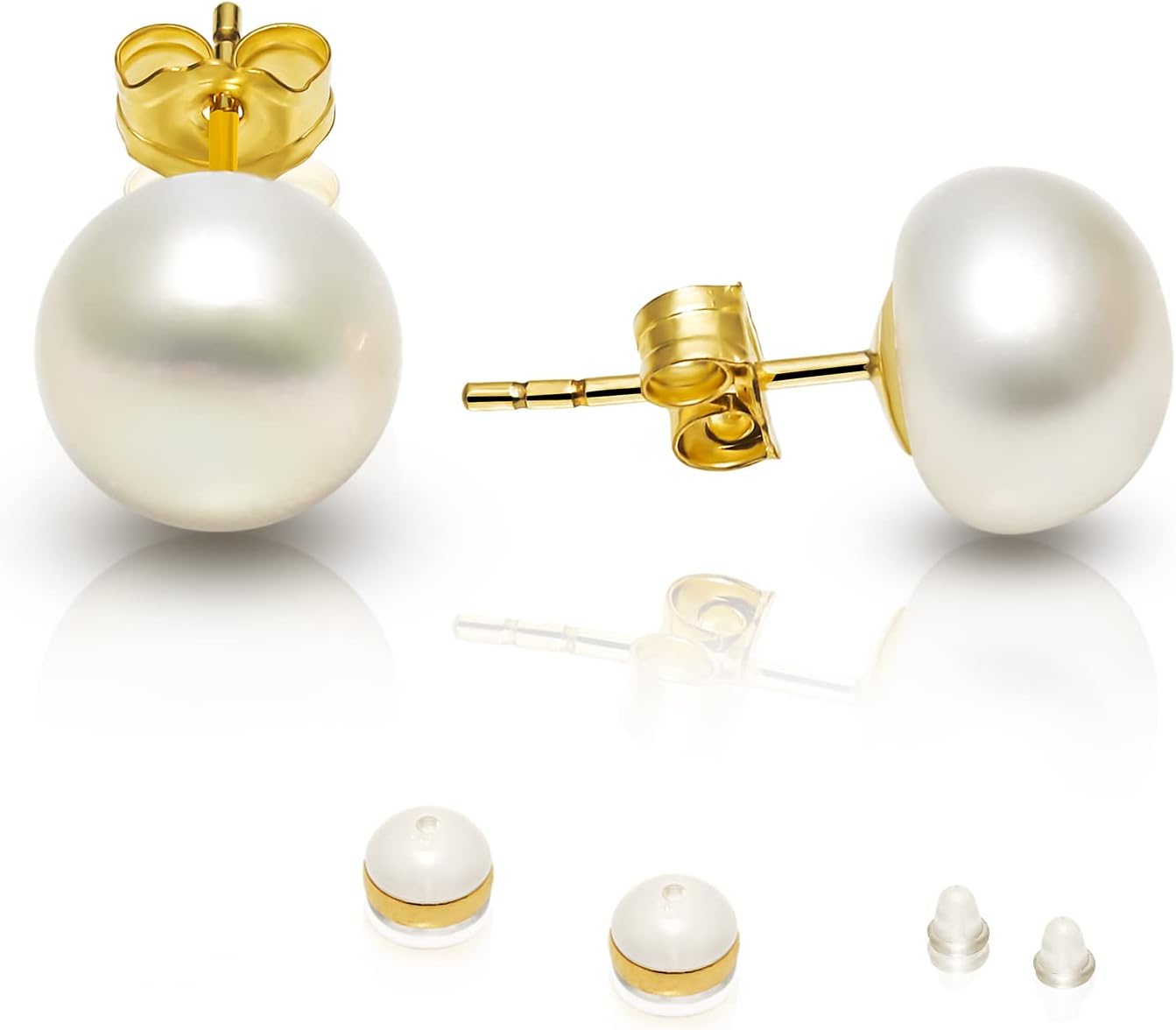 Cowlyn Pearl Stud Earrings 14k Gold Plated 925 Sterling Silver Post Hypoallergenic Earring, Freshwater Cultured Pearl Earrings Shiny Earrings for Women 6-10mm