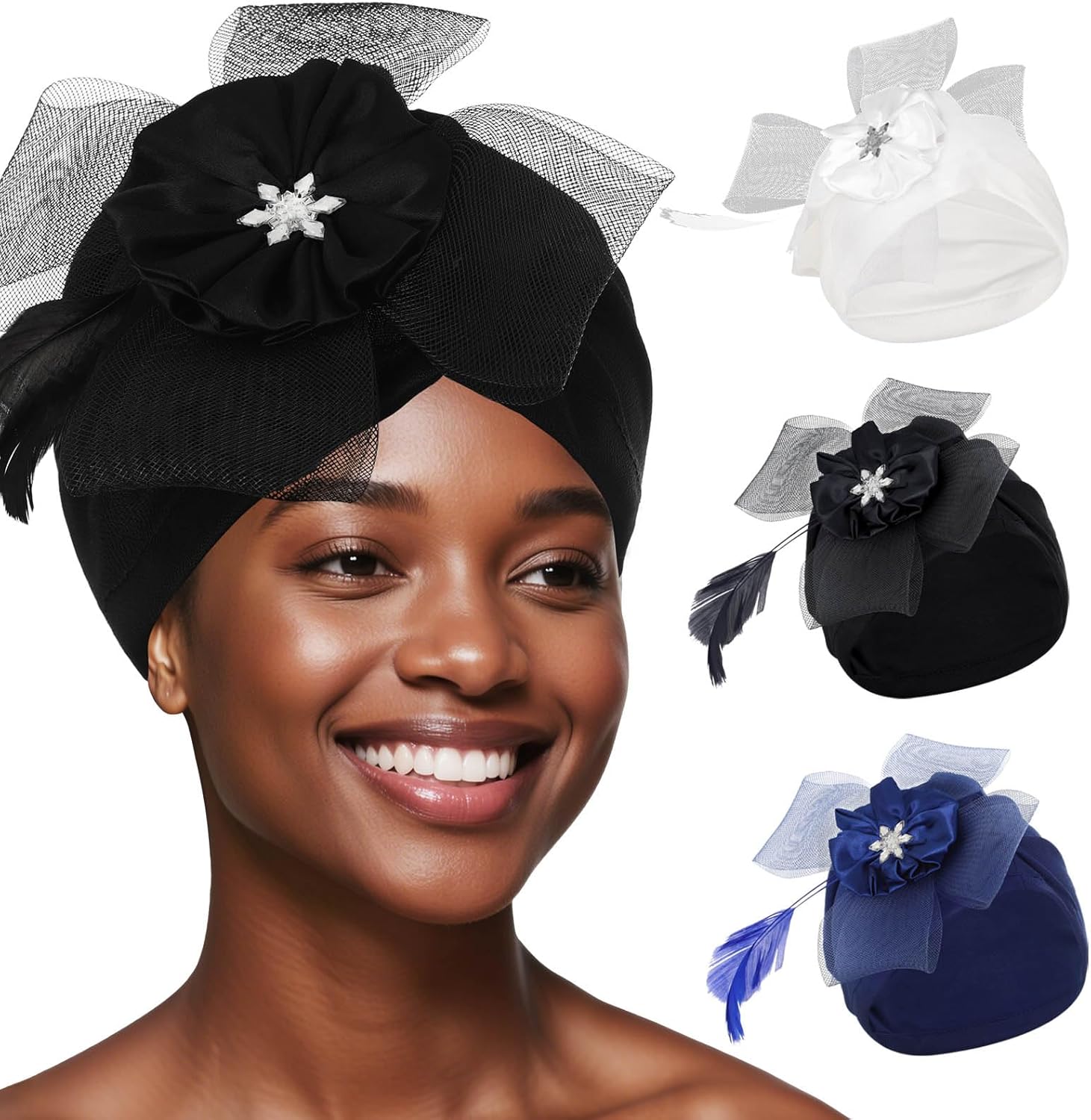 Bohend 3PCS Women Turbans Beanie Caps Pearl Flower Rhinestone Headwarp Feather Pleated Headbands Head Cover Hat