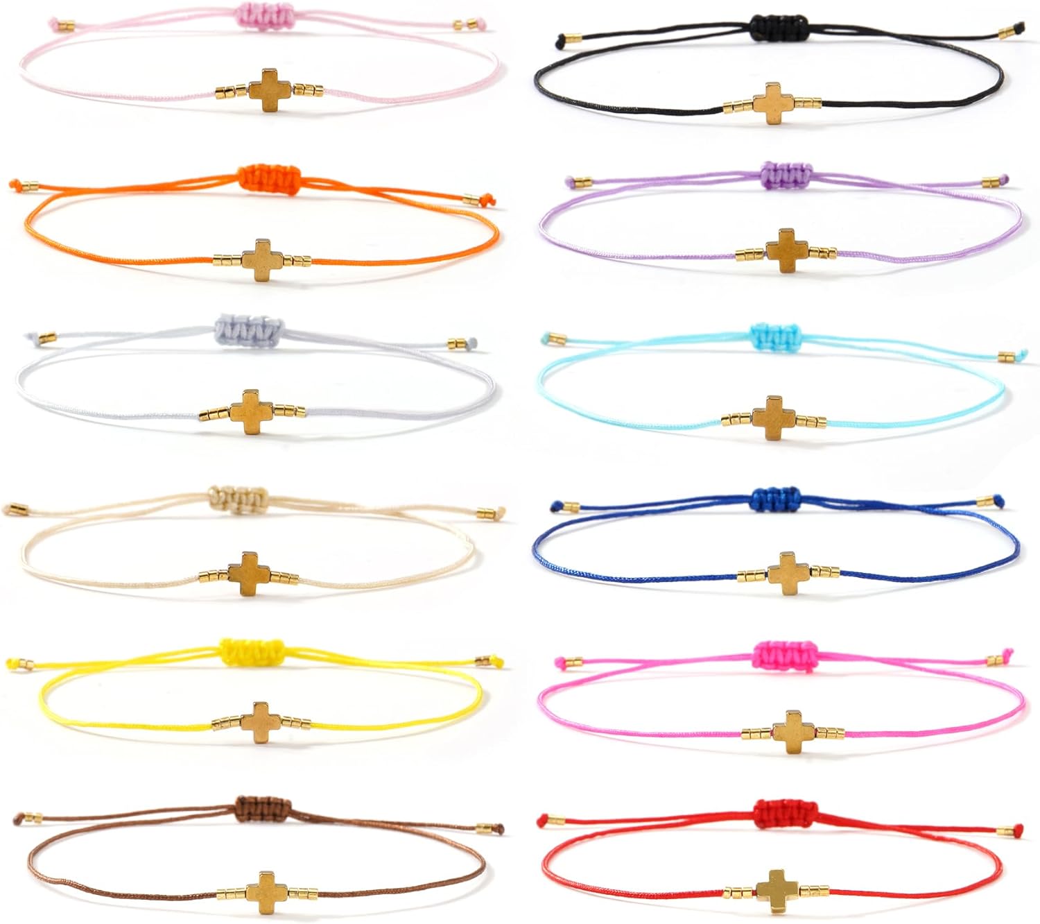 12PCS Gold Cross Bracelets for Women Handmade Beaded Colorful Adjustable String Stackable Friendship Wish Bulk Cross Bracelet Stack Rope Christian Jewelry Religious Baptism BFF Lucky Gift
