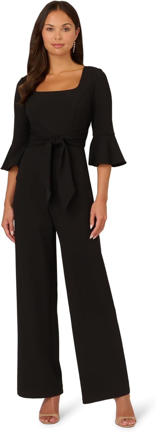 ADRIANNA PAPELL Women's Knit Crepe Tie Front Jumpsuit | Formal One Piece Jumpsuit with Bell Sleeves & Wide Leg Design