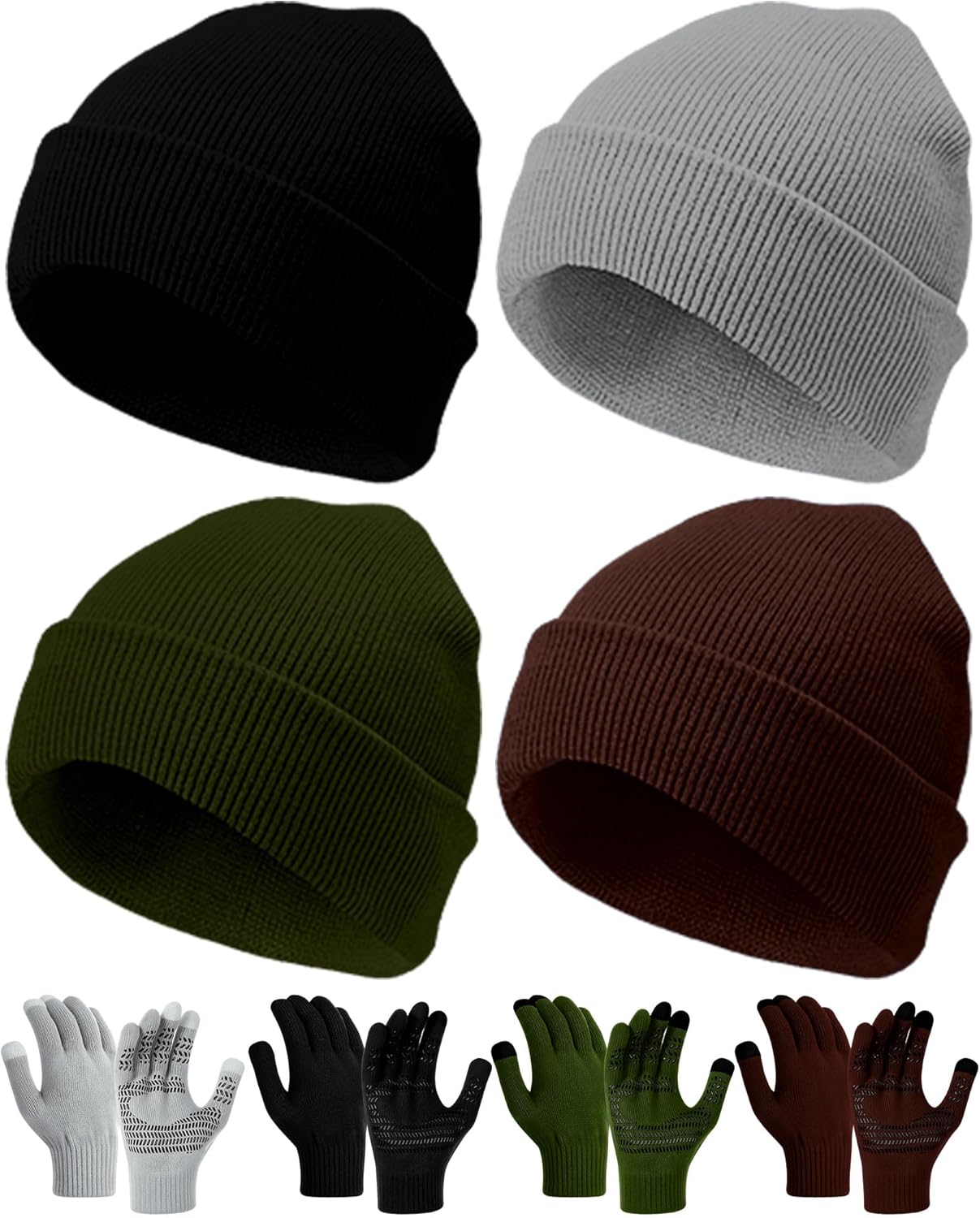 8 Pcs Winter Beanies and Gloves Set for Men Women, Stretchy Knitted Hats Touch Screen Gripper Glove Unisex Warm Gift