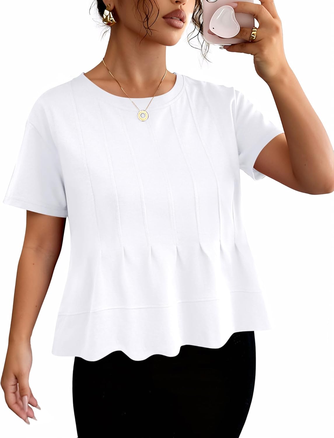 LOMON Spring Peplum Tops for Women Babydoll Pleated Short Sleeve Crop Swing Shirts Blouses Trendy Casual Clothing 2026