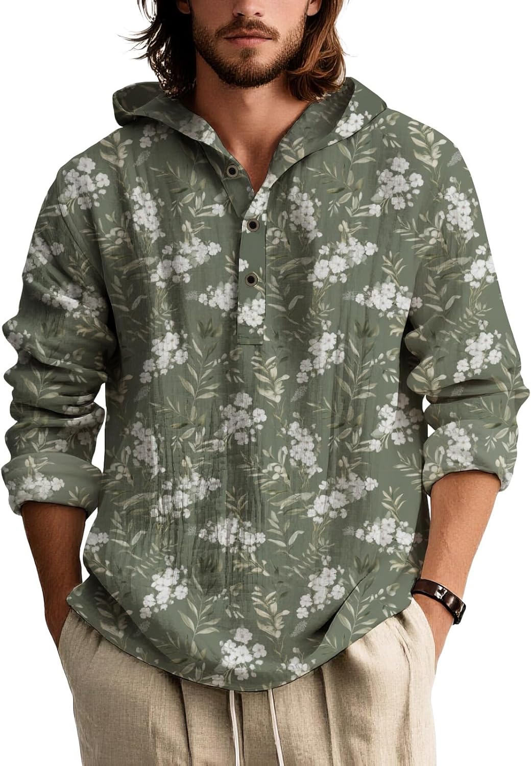 Mens Hooded Floral Button Down Shirt Long Sleeve Lightweight Relaxed Fit Nature Inspired Top for Spring