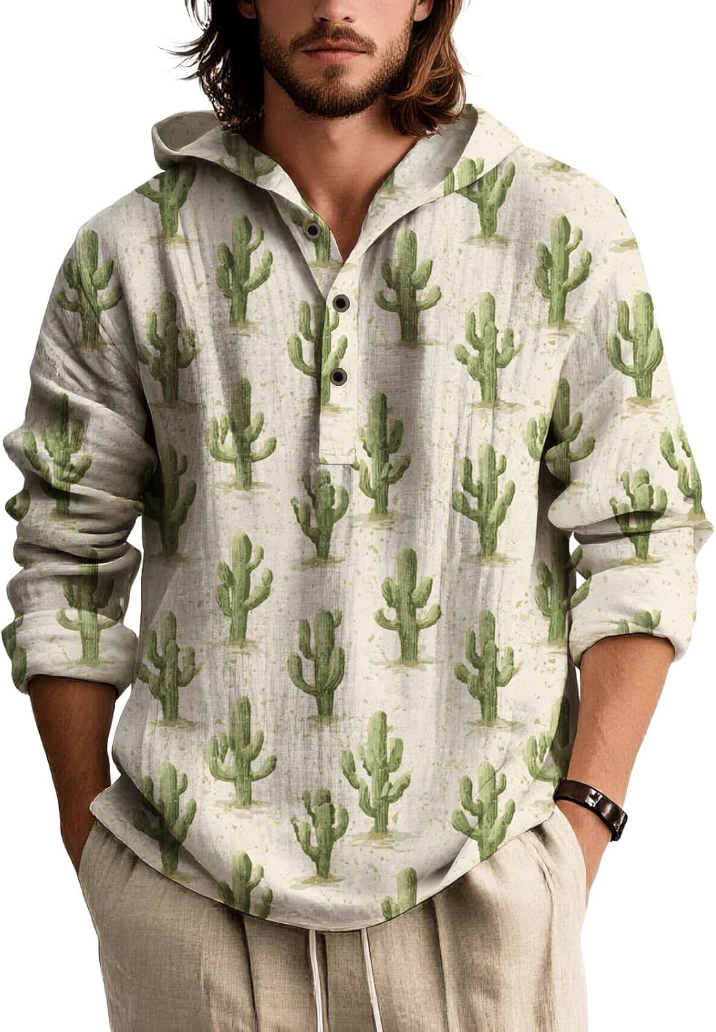 Mens Hooded Floral Button Down Shirt Long Sleeve Lightweight Relaxed Fit Nature Inspired Top for Spring