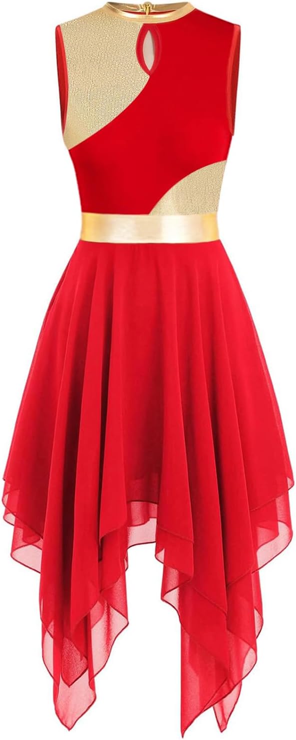 Praise Dance Tunic Dresses for Women Sleeveless Gold Color Block Irregular Flowy Skirt Worship Lyrical Dance Costume
