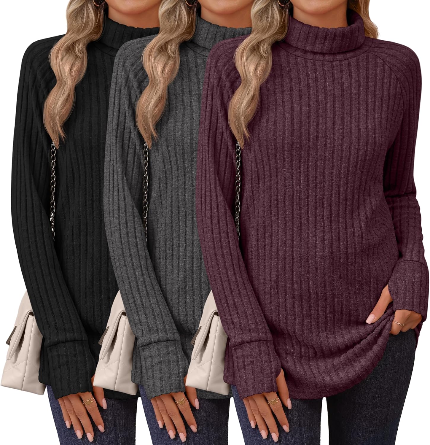 Ficerd 3 Pack Women's Turtleneck Long Sleeve Tunic Sweater Thumbhole, Ribbed Raglan Curved Hem Knit Shirts Loose Fall Winter