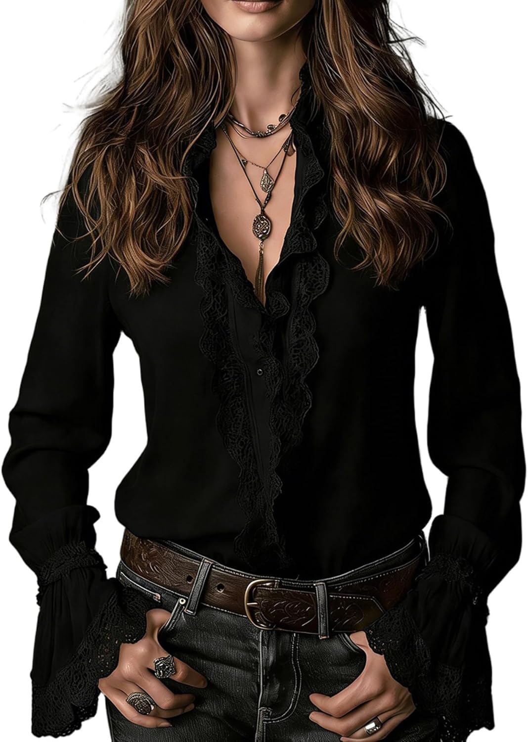 Boho Ruffle Lace Blouse for Women White V Neck Long Bell Sleeve Button Front Casual Chic Top