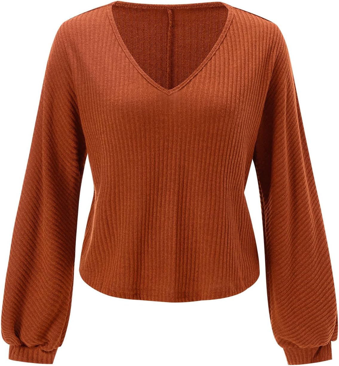 Women's Lantern Long Sleeve T Shirts Fall Basic V Neck Knit Dressy Casual Tops
