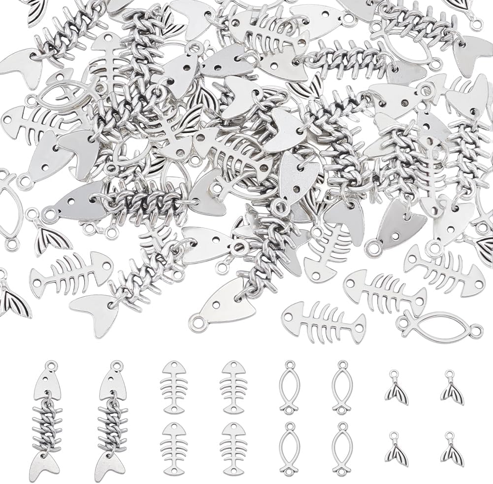 NBEADS 80 Pcs 4 Styles Alloy Fish Bone Charms, Decor Fish Bone Design Charm Connector Ocean Fishbone Pendants for Jewelry Making Charms Pendants Necklaces Keychains DIY Crafts