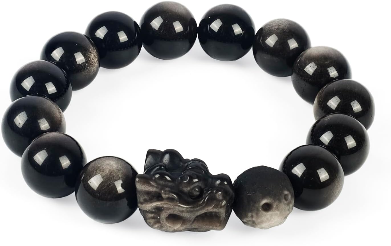 Natural Obsidian Bracelet For Men 10MM | Adjustable Stone Beaded Bracelet | Handmade Obsidian Stretch Elastic Bracelet for Men Women Gifts | with Dragon-Head Sculpture | Black and Silver 7.5"