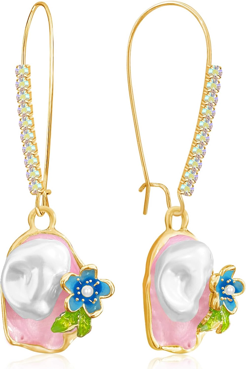 14k Gold Sparkly Crystal Enamel Flower Leverback Earrings Pearl Oval Picture Frame Dangle Drop Earrings For Women