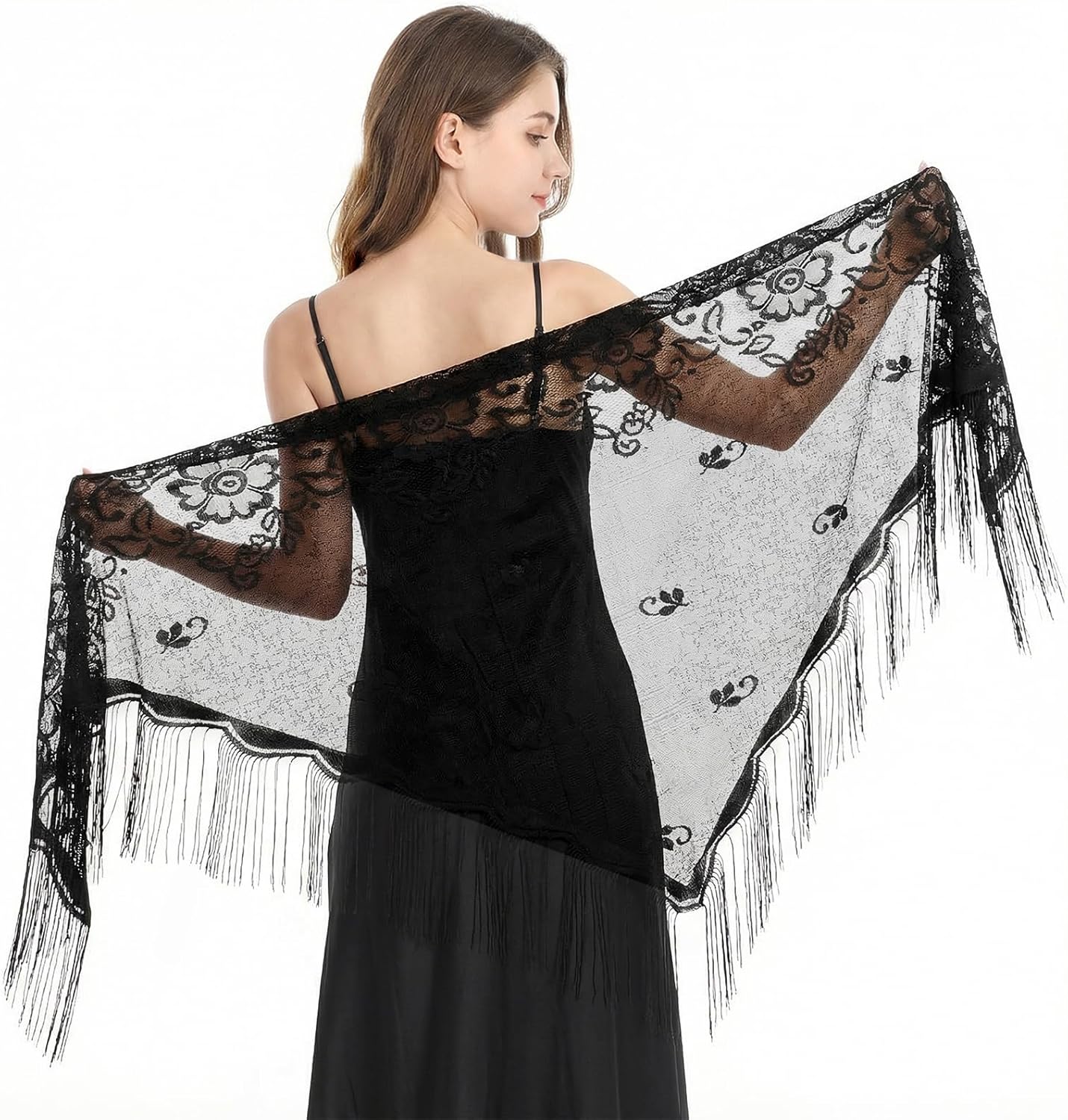 Black Lace Shawl Ladies Triangle Lace Shawls and Wraps with Tassels for Evening Party Wedding